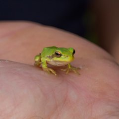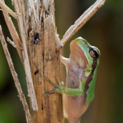 Wie der Name erahnen lässt, fühlt sich der Laubfrosch in Hochstaudenfluren und Gehölzen am wohlsten. Dank seiner Haftscheiben an den Enden der Finger und Zehen hat er kein Problem, sich an Blättern und Ästen festzuhalten.
